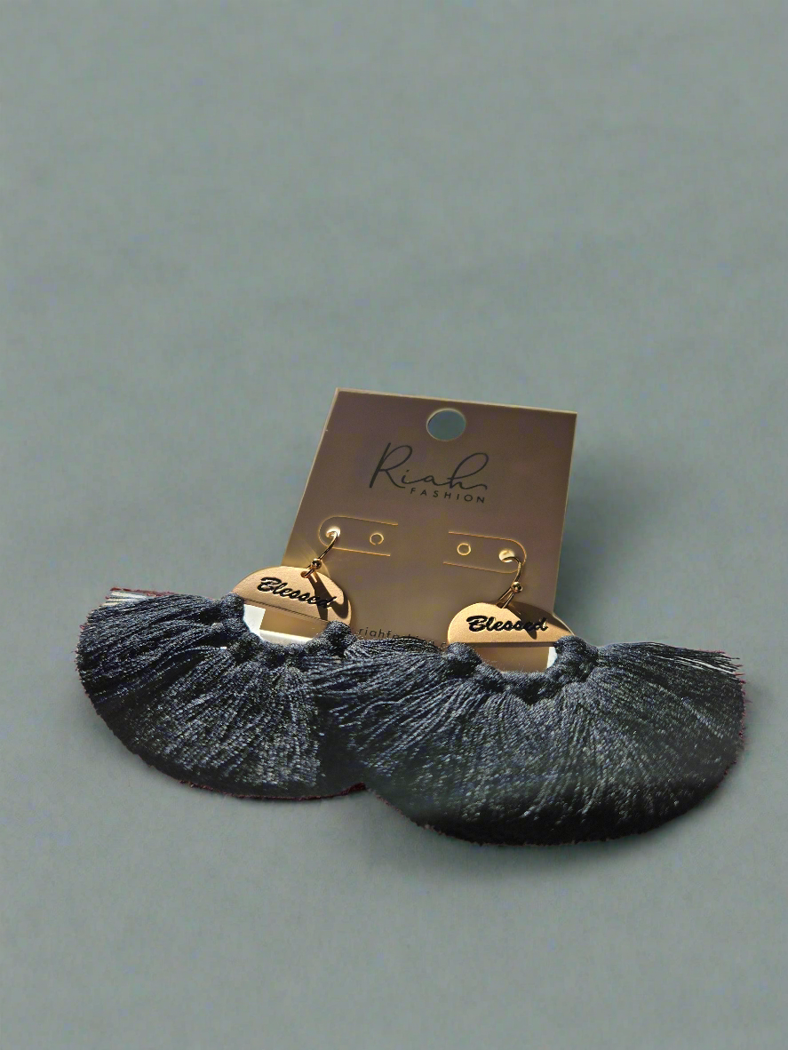 Gold Earrings With Black Fan And Stamped Blessed On The Top.