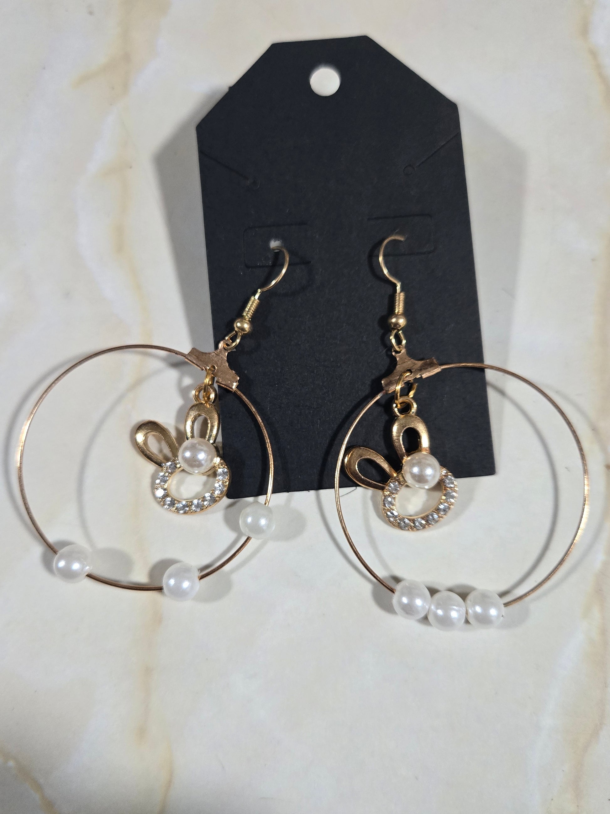 Find your fairytale with the Hoppy Ever After Hoops! These charming earrings blend playful whimsy with delicate elegance. A graceful gold-tone hoop is accented at the bottom by three tiny, luminous faux pearls. The true star is the adorable, sparkling bunny charm, detailed with shimmering rhinestones and a pearl belly. These drops are light, bright, and perfect for anyone who believes in magic, happily ever afters, and the sweetest kind of style.
