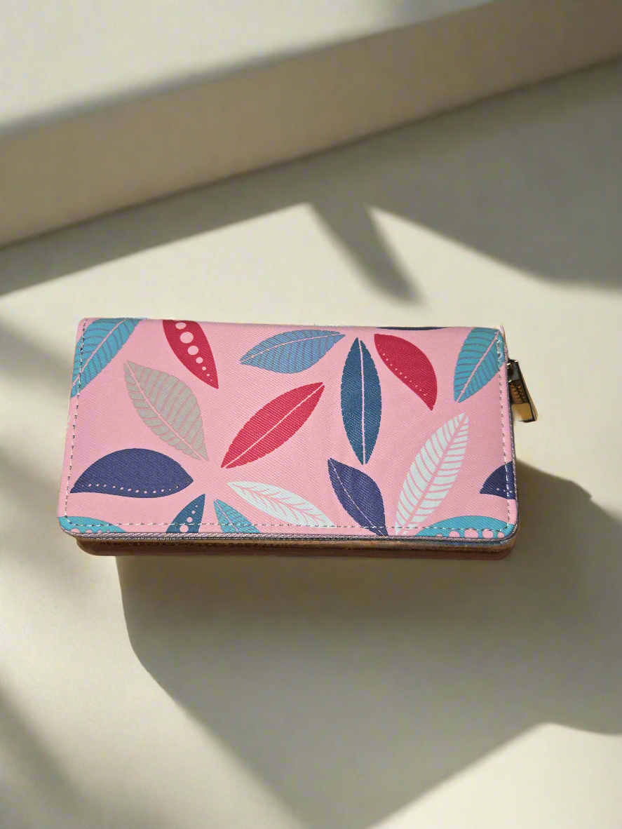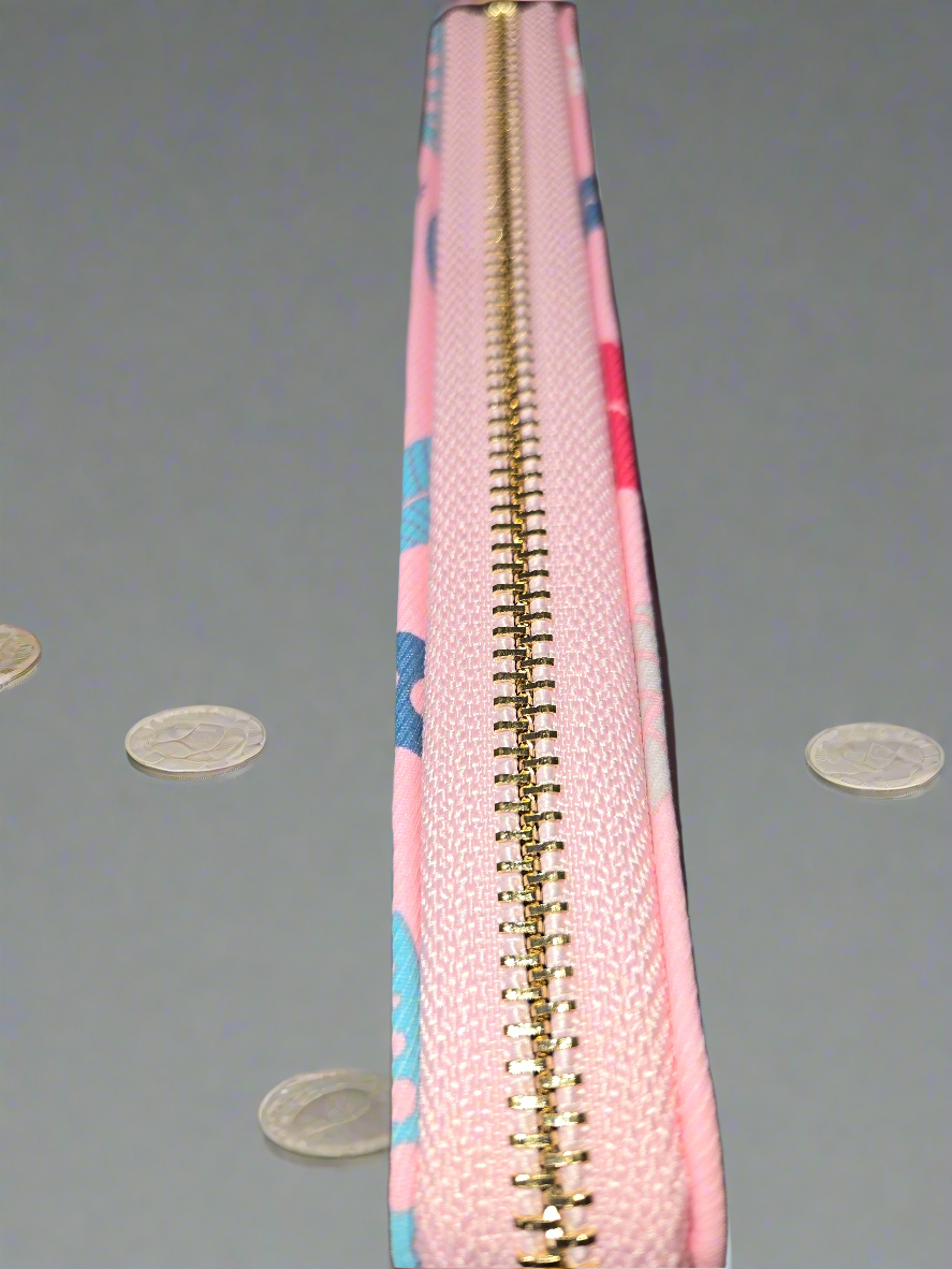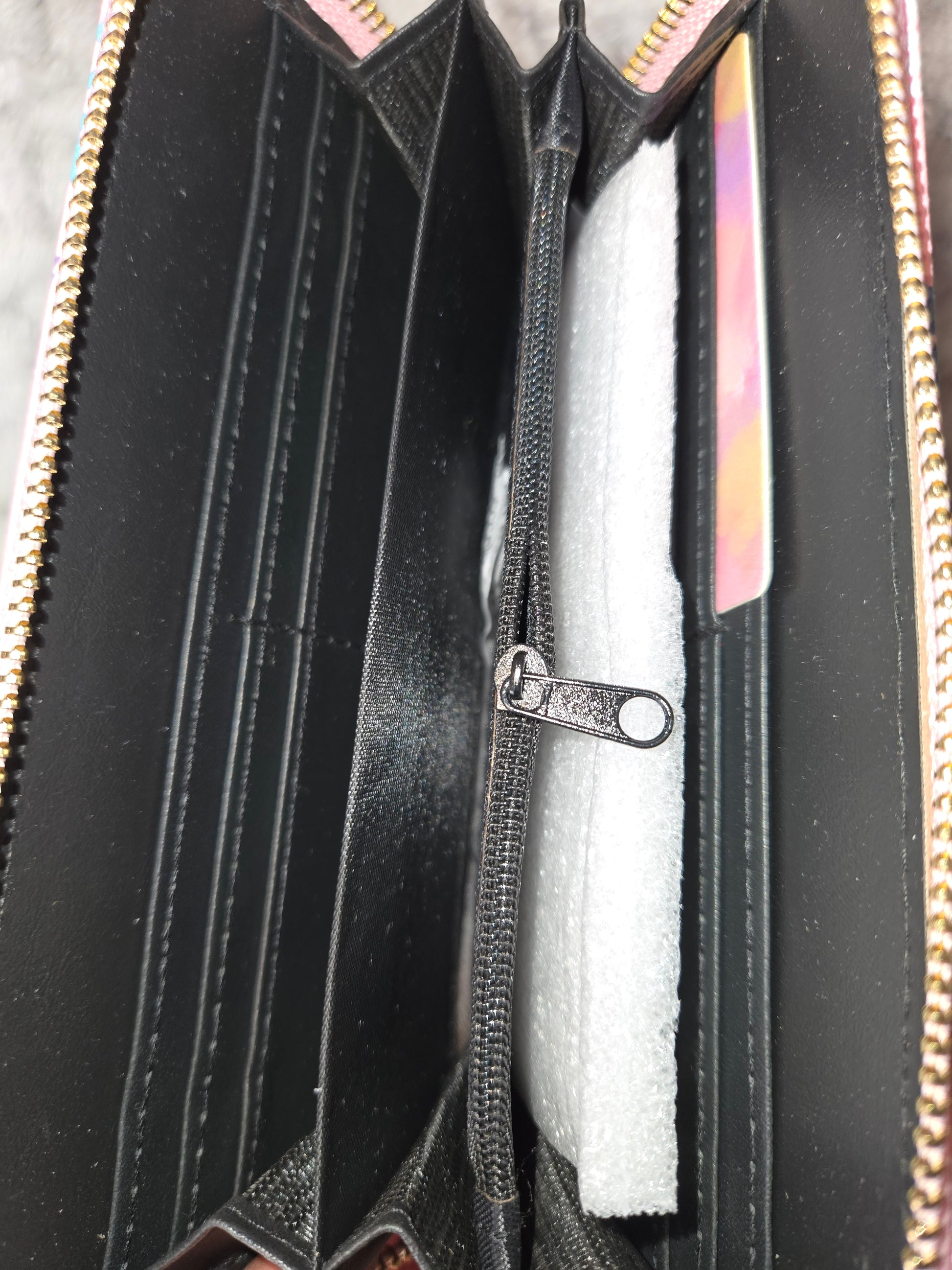 Elegant and functional, this pink wallet features 16 dedicated card slots, two spacious compartments for dollar bills, and a secure zippered pouch for loose change. Perfect for keeping your essentials neatly organized in style.