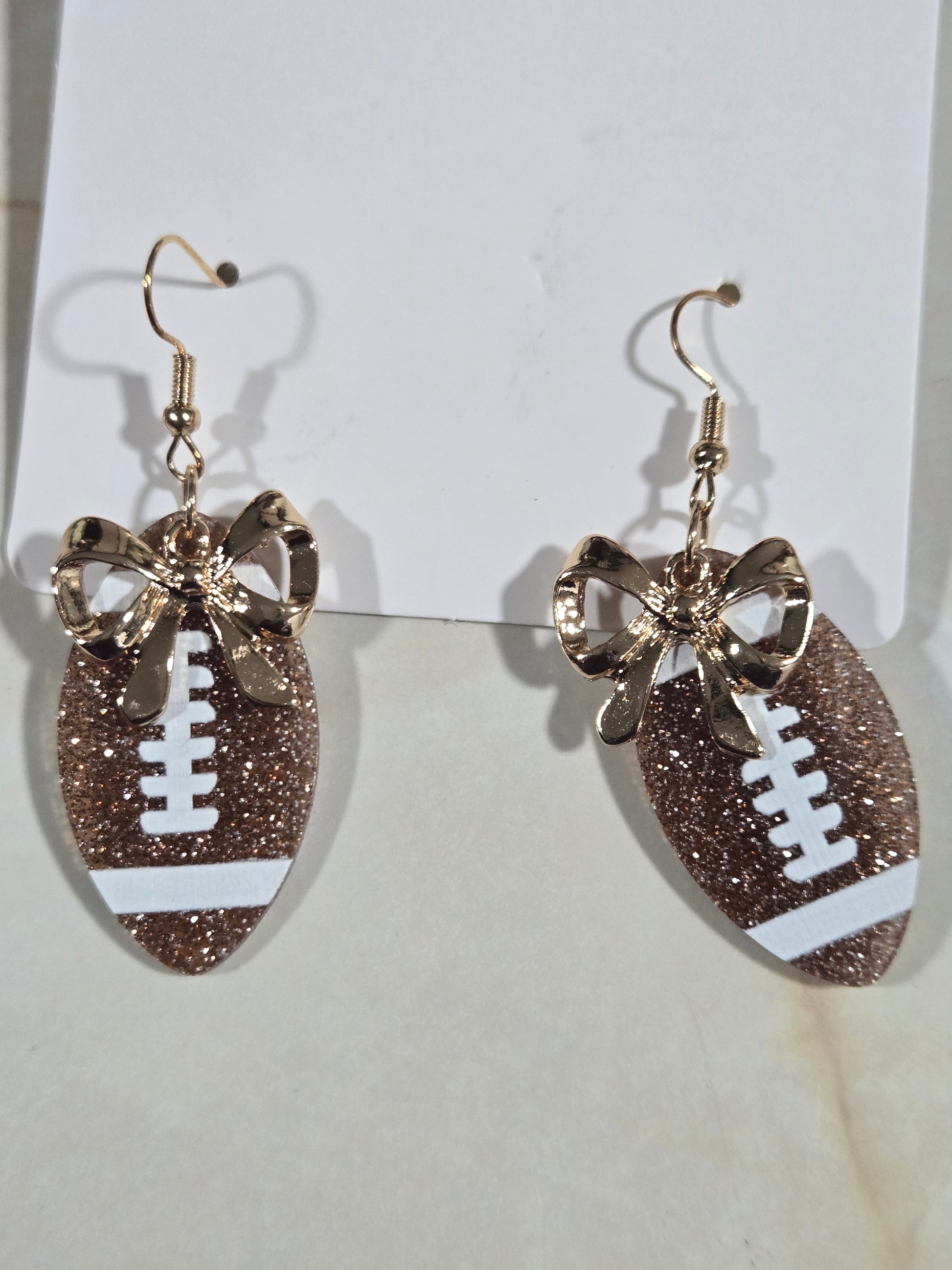 These earrings are designed for the fan who loves football but never sacrifices sparkle. Featuring a perfectly scaled brown glitter football and topped with a gorgeous gold bow, these small drops bring just the right amount of glamour to your pre-game party or stadium seat. They're lightweight, elegant, and the ultimate accessory for showing your team spirit with a touch of dainty style.