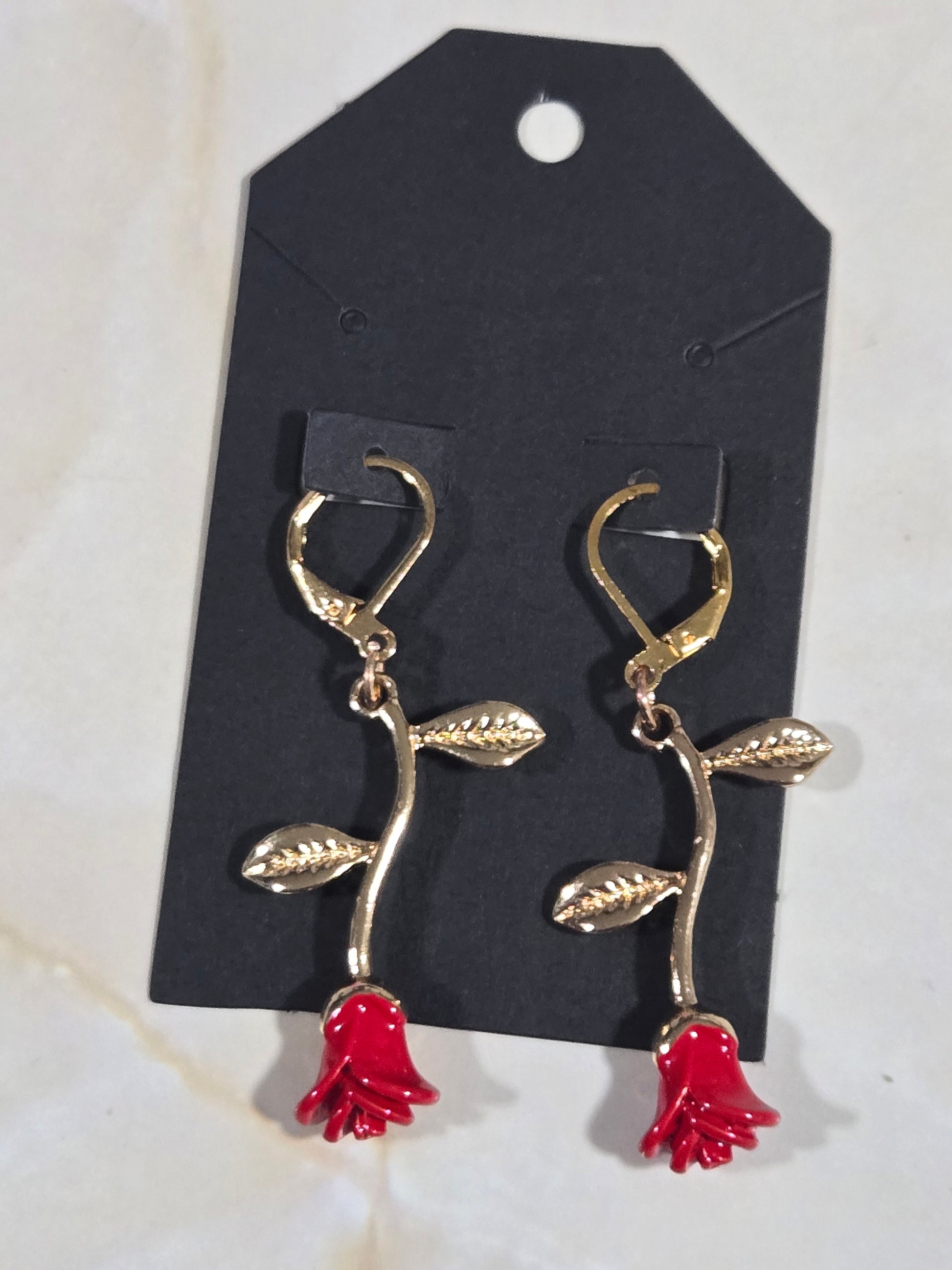 Step into the spotlight with the Thorn & Petal Dancers earrings, where romance and glamour entwine. These stunning drops feature a rich, scarlet enameled rose suspended from an elegantly curved, gold-toned stem with delicate leaf accents. The design is fluid and captivating, mimicking a rose swaying in a secret garden at midnight. Perfect for a date night, a romantic gesture, or any occasion that calls for a touch of dramatic, timeless beauty. They don't just accessorize an outfit—they become the centerpiece of your love story.